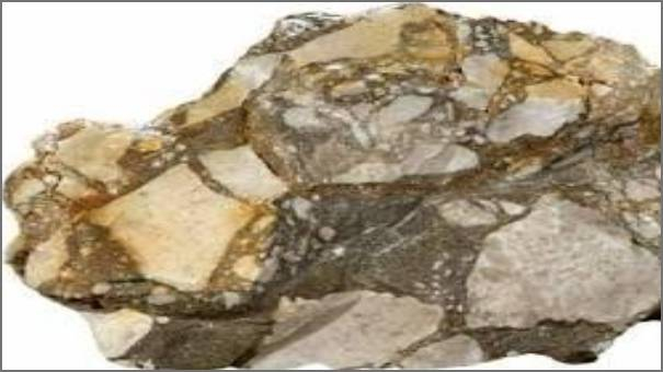 - صخر البريشة (Breccia): يتكون من حبيبات حادة الزوايا أكبر من حبيبات الحجر الرملي، مما يدل على أن هذه الحبيبات لم تنتقل لمسافات طويلة.