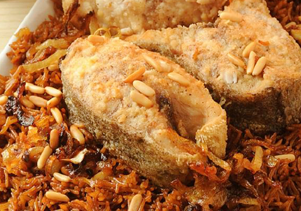 - بعد أن تنضج الصيادية نسكبها في صحن كبير للتقديم ونزينها بالصنوبر المقلي، وباقي كمية السمك المقلي.