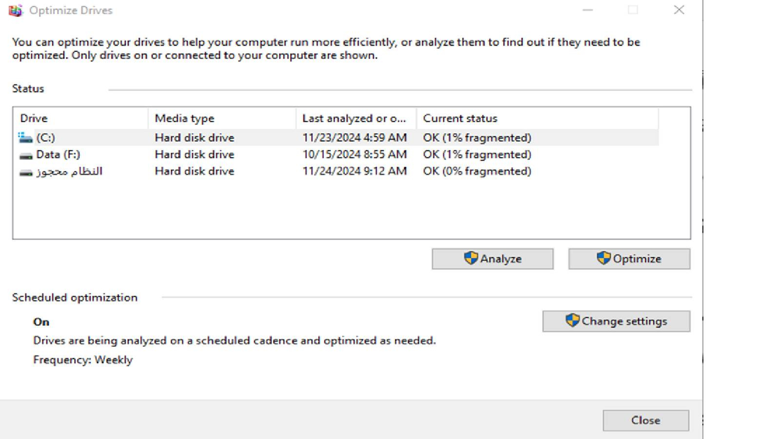 افتح "إلغاء التجزئة وتحسين محركات الأقراص" عن طريق الضغط على Windows + S والبحث عن "إلغاء التجزئة". حدِّد هنا القرص وانقر على "تحليل" (Analyze) للتحقق من حالة التجزئة. انقر على "تحسين" إذا كانت هناك حاجة لإلغاء التجزئة وتحسين أداء القرص الصلب.