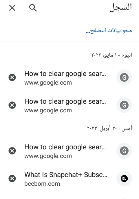 كما تستطيع الضغط على رمز "X" بجوار الصفحة لحذف عمليات البحث التي تجريها، وبمجرد إتمام الخطوات السابقة سيختفي كل سجل جوجل بما يتضمن سجل البحث؛ لذا يجب التأكد من حفظ أي مواقع وبيانات ومعلومات شخصية أخرى في مكان آخر.
