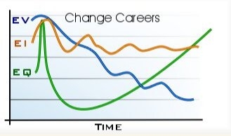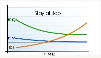 من الصعب بكلِّ المقاييس أن تُقرر ما إذا كان عليك ترك وظيفتك، والبدء بمهنة جديدة، لكن عليك أن تنظر إلى المشكلة من هذا المنظور الجديد؛ إذ يوضح هذا الرسم البياني تأثير كلَّ قرار في الجودة العاطفية (EQ)، والتنوع العاطفي (EV)، والشدة العاطفية (EI):