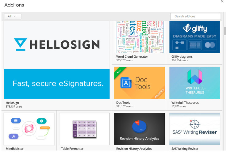هناك عدد كبير من "الإضافات" (Add-Ons) التي يمكنها توسيع الإمكانيات المجانية التي تحصل عليها في كل من Docs وSheets. يمكنك البحث عنهم وتنشيطهم:
